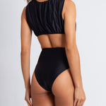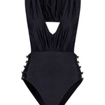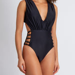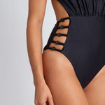 Perry one piece in black Obsidian stretch-polyamide lux swimwear fabric. Perry features a plunge neckline, a ruched high back, and a high-waisted bottom with open ladder details for a sexy peek-a-boo look with moderate coverage. Also available in Flor Ink.